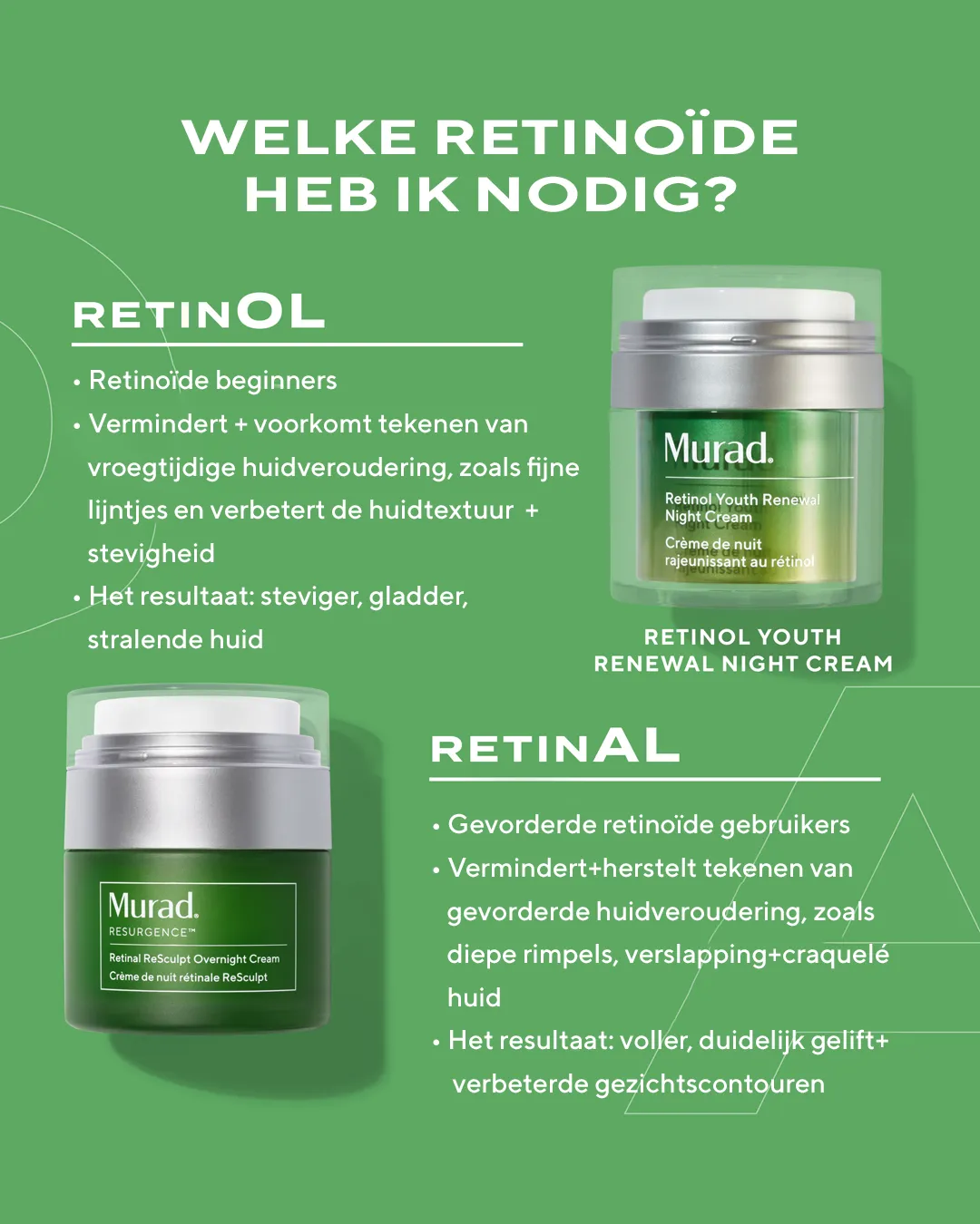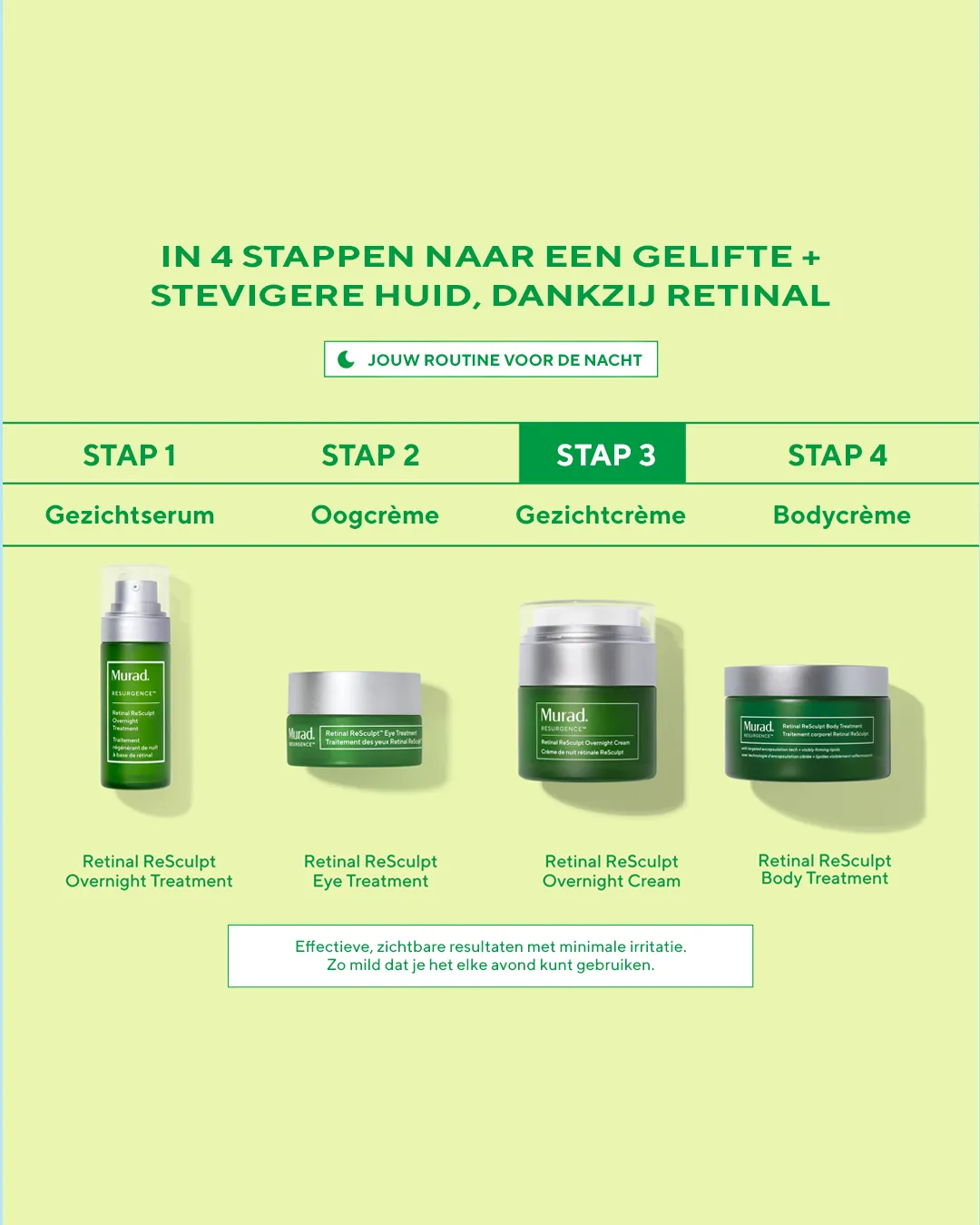 Tijdens de nacht herstelt de huid zich het meest intensief. Maar naarmate we ouder worden, vertraagt dit proces. Hierdoor ontstaan diepe rimpels, verslapping, volumeverlies en een craquelé huidstructuur. De Retinal ReSculpt Overnight Cream speelt hier strategisch op in door precies op dit moment krachtige, bewezen ingrediënten te activeren die het herstelvermogen van de huid opnieuw stimuleren.